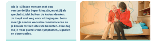 Als je cliënten mensen met een verstandelijke beperking zijn, moet jij als specialist juist buiten de kaders denken. Je loopt niet weg voor uitdagingen. Soms moet je zonder woorden communiceren en je kennis tot het uiterste benutten. Elke dag sta je voor puzzels van symptomen, signalen en observaties.