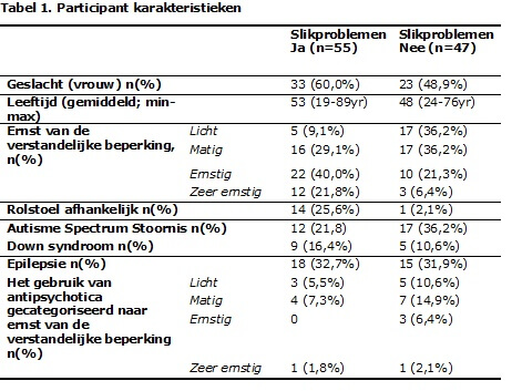 Conclusie: Slikproblemen komen regelmatig voor bij volwassenen met een verstandelijke beperking en zijn geassocieerd met hulp nodig hebben tijdens de maaltijd, hoesten, proppen, het hebben van een ernstige tot zeer ernstige verstandelijke beperking en het niet gebruiken van antipsychotica.