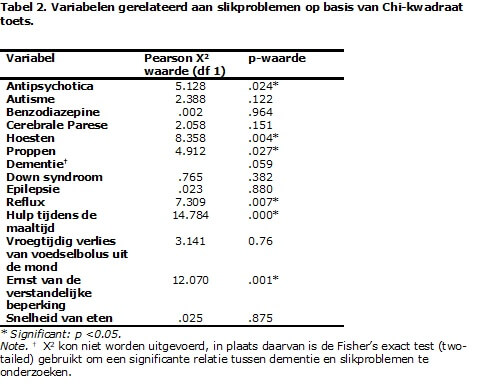 Variabelen met een positieve associatie tot slikproblemen waren toenemende hulp tijdens de maaltijd (p = 0.000), hoesten (p = 0.004), proppen (p = 0.027) en het hebben van een ernstige tot zeer ernstige verstandelijke beperking (p = 0.001). Het gebruik van antipsychotica had een negatieve associatie met slikproblemen (p = 0.024).