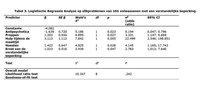 In het logistisch model zijn de variabelen meer hulp nodig hebben tijdens de maaltijd, hoesten, proppen en het hebben van een (zeer)ernstige verstandelijke beperking positief geassocieerd. Het gebruik van antipsychotica was negatief geassocieerd.